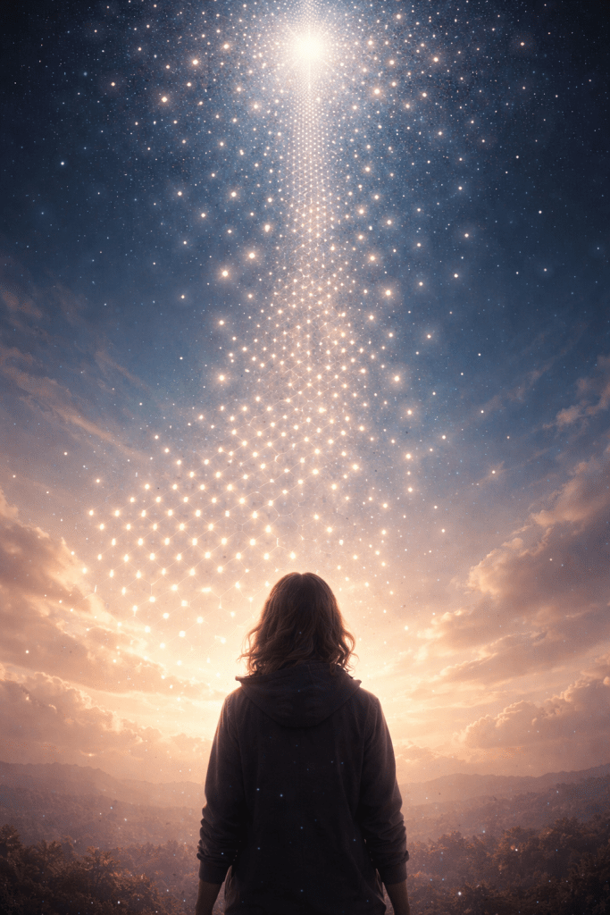 Au début, cela formait comme un quadrillage, presque parfait, comme une structure invisible posée au-dessus de nous. Les points bougeaient dans tous les sens, vivants, vibrants… comme s’ils suivaient une intelligence que je ne comprenais pas.